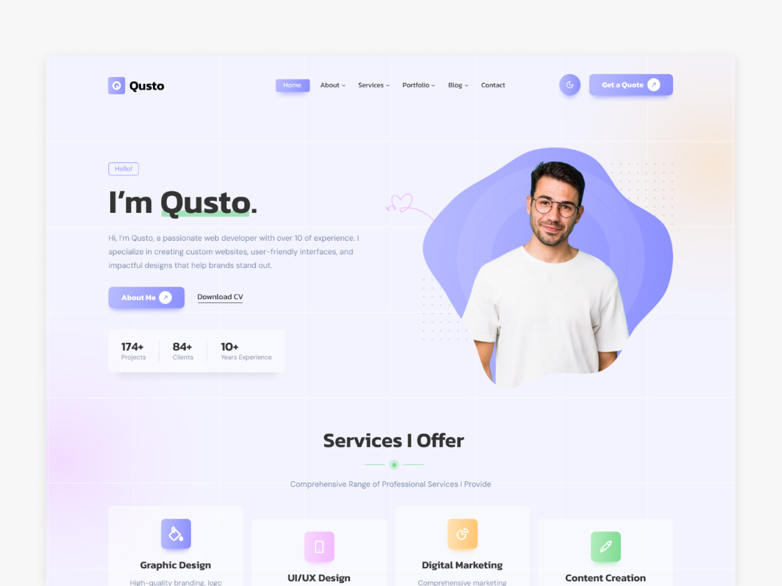 Qusto is a sleek and modern personal portfolio website designed for some of my customer an Envato author. Crafted in Figma, this UI/UX project focuses on clean aesthetics, intuitive navigation, and a visually striking layout to showcase the client’s work effectively.
